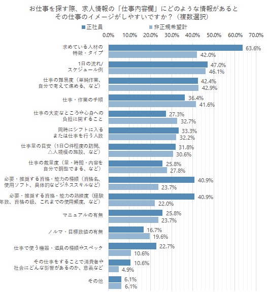 正社員希望者たちで最も多かったのは「求める人材の特徴・タイプ」(63.6%)、次いで「1日の流れ/スケジュール例」(47.0%)、「仕事の難易度」(42.4%)という結果に。非正規希望全体でみると、最多は「1日の流れ/スケジュール例」(46.1%)、次いで「仕事の難易度」(42.9%)、「求めている人材の特徴・タイプ」(42.0%)だった。