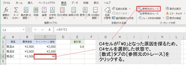 この原因を探るため、「参照元のトレース」機能を使ってみよう。C4セルを選択した状態で、[数式]タブの[参照元のトレース]をクリックする。
