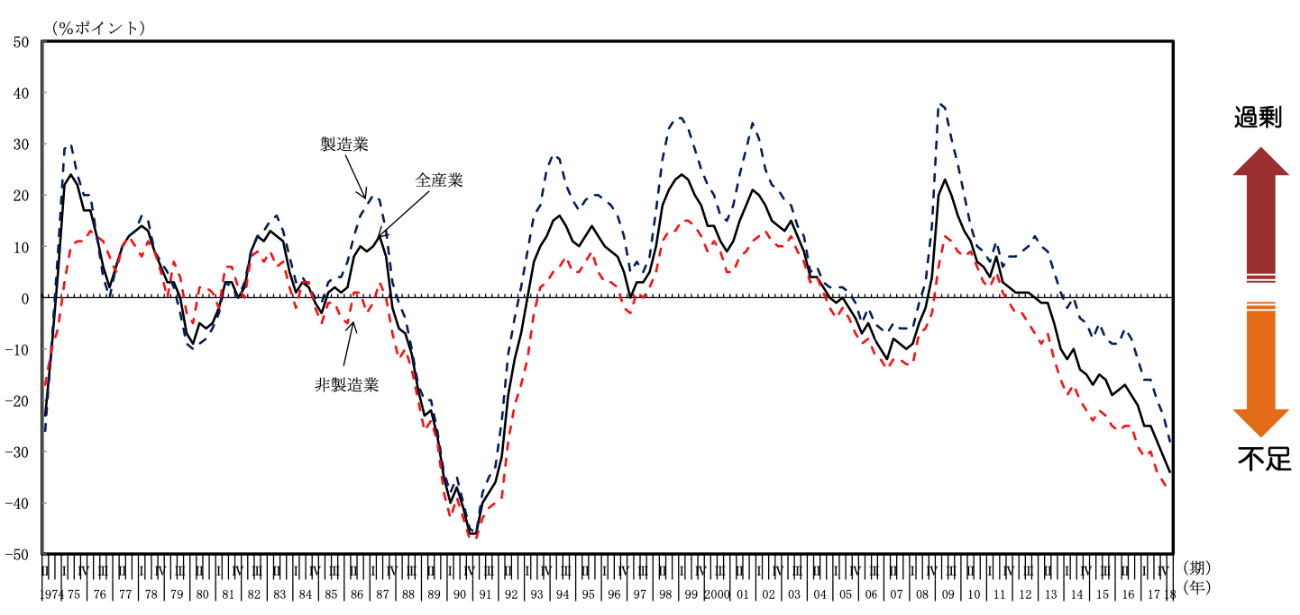 ・全産業で見た場合、不足超の状況が20期続いている
