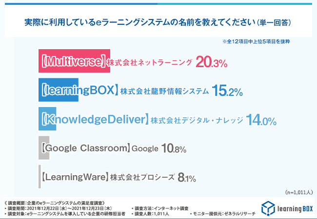 本アンケートでは最初に、自社でどのeラーニングシステムを使っているかについて尋ねた。結果は「Multiverse」(株式会社ネットラーニング)と回答した人が最も多く、20.3%に。以下、「learningBOX」(株式会社龍野情報システム)15.2%、「KnowledgeDeliver」(株式会社デジタル・ナレッジ)14.0%と続いた。