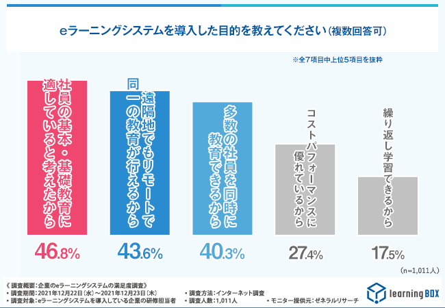 次に、eラーニングシステムの導入目的を尋ねた(複数回答可)。最も多かった回答は「社員の基本・基礎教育に適していると考えたから」(46.8%)で、全体の半数近くを占めた。ほか「遠隔地でもリモートで同一の教育が行えるから」(43.6%)、「多数の社員を同時に教育できるから」(40.3%)が選ばれた。