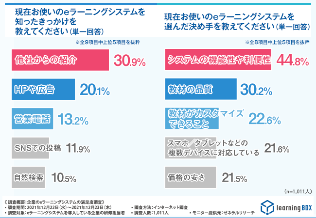 また、現在使っているeラーニングシステムを知ったきっかけを質問したところ、「他社からの紹介」が30.9%で最多回答に。次いで「HPや広告」(20.1%)、「営業電話」(13.2%)だった。広告や営業よりも、紹介=信頼できる相手からの情報が動機となったようだ。