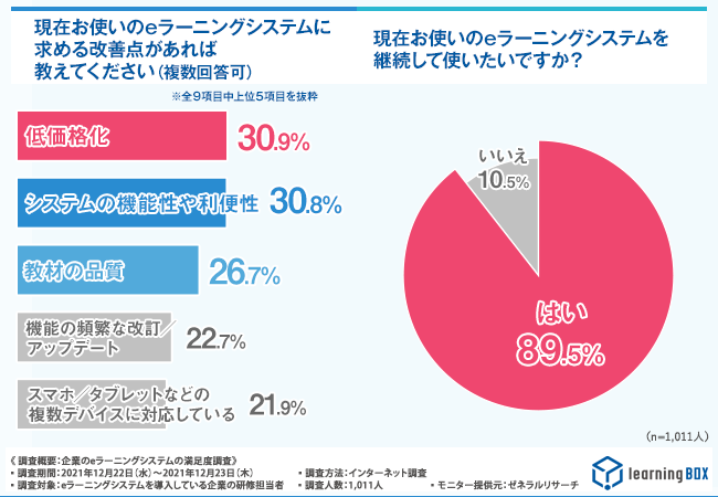 そういった不満があるなか、現在使っているeラーニングシステムを継続して使いたいか尋ねたところ、「はい」が89.5%となり、おおむね今のシステムに肯定的な人が圧倒的に多かった。利用開始時に慎重に選び、納得して使い始めた企業が多いと言えそうだ。