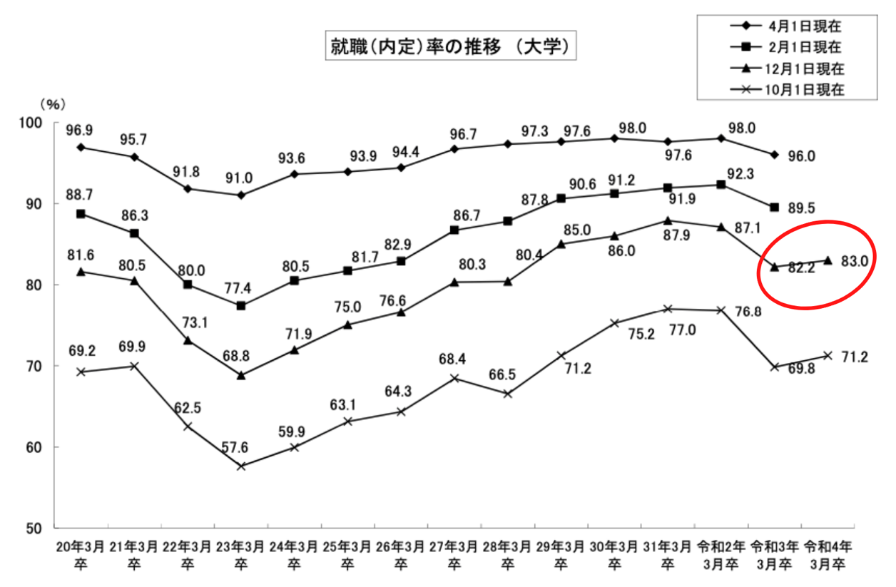 2022年1月、厚生労働省は22年卒業予定者の就職内定状況を公表しました。それによれば、大学生の就職内定率は12月1日時点で83.0%と前年同月比で0.8%上回っています。