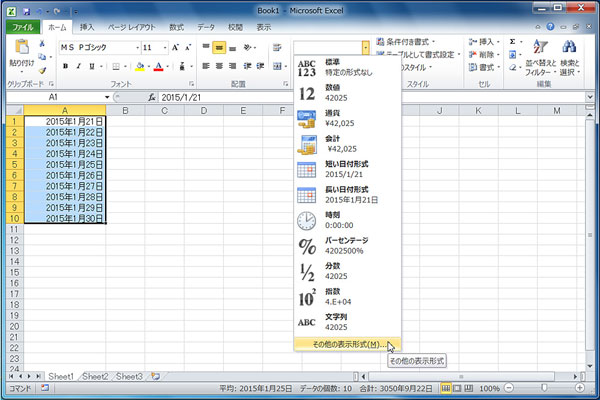 表示形式を定義するには、目的のセル範囲を選択した状態で、[ホーム]タブの[表示形式]のドロップダウンから、[その他の表示形式]をクリックする。