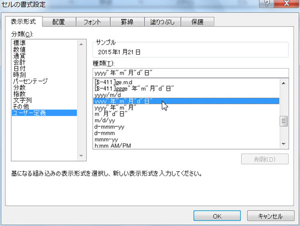 ユーザー定義の表示形式を追加するには、まずは「種類」の一覧から、基本となる表示形式である[yyyy"年"m"月"d"日"]を選ぶ。すると、一覧の上のボックスに表示される。