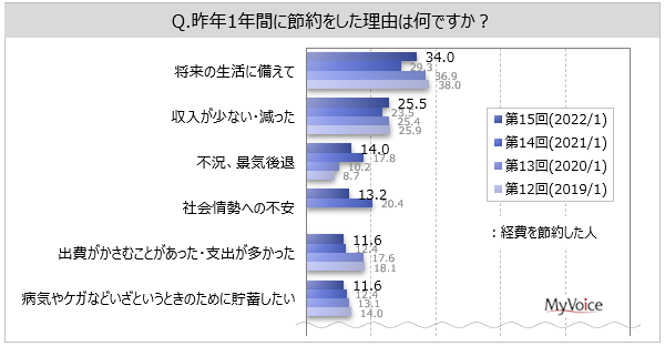 最も多かったのが「将来の生活に備えて」(34.0%)、以下「収入が少ない・減った」(25.5%)、「不況、景気後退」(14.0%)、「社会情勢への不安」(13.2%)だった。2021年調査と比べて、「将来の生活に備えて」が微増、「社会情勢への不安」が微減している。