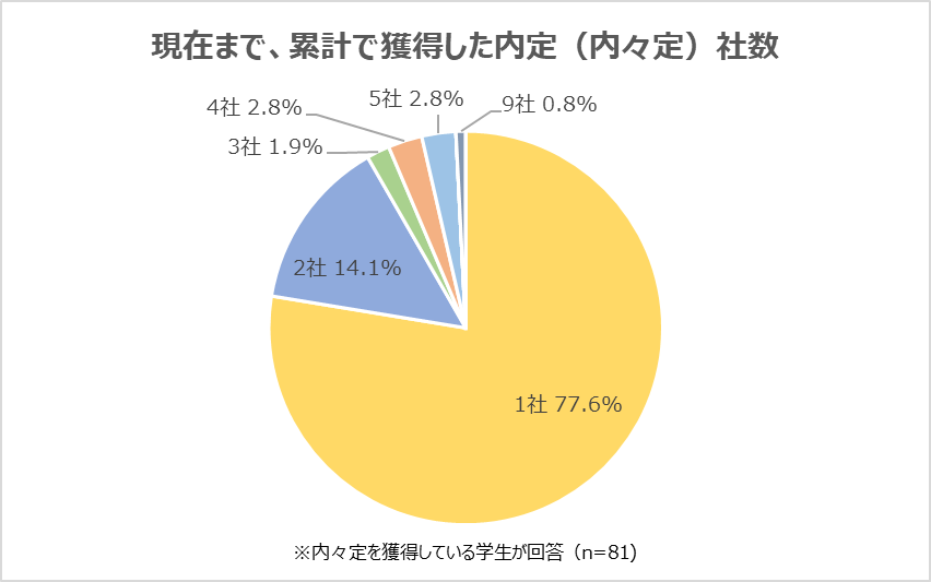 結果は「1社」(77.6%)が最多。次いで「2社」(14.1%)が多かった。また、内々定を獲得している学生1人あたりの平均内々定獲得社数は「1.44社」に。1人あたりの平均内々定保有数は「1.27社」となっており、内々定獲得と共に、内々定辞退も行っていることが分かった。