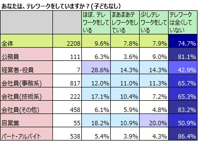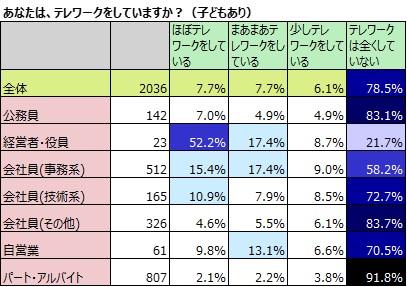 コロナ禍となって2年以上たつが、テレワークを全くしていない女性が7割を超え、現実はあまり浸透していないことがわかった。また、子どもがいる女性の方がテレワークをしていない割合が高く、職業別で見ると最もテレワークをしていない職種は「パート・アルバイト」で約9割だった。
