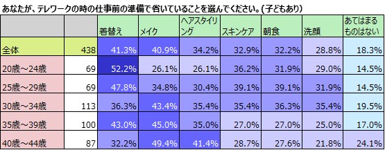 その結果、最も省いている“朝の準備”は「メイク」(44.9%)、続いて「着替え」(40.7%)、「ヘアスタイリング」(39.5%)と、身だしなみ関連が上位を占めた。「着替え」を省いているのは、子どもの有無にかかわらず約4割だが、「メイク」は子どもあり派が40.9%、子どもなし派が48.1%で、多少開きがあった。