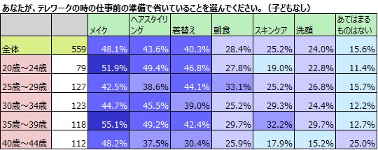 テレワーク生活によって、メイクやスキンケアを含む身だしなみに大きな影響があったことがわかる興味深い結果となった。実は朝の準備を“さぼっている”人が多いという結果に、思わず納得してしまった人もいるのではないだろうか。