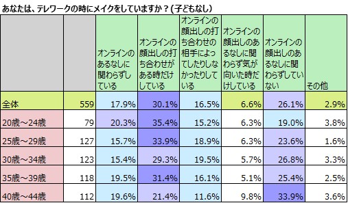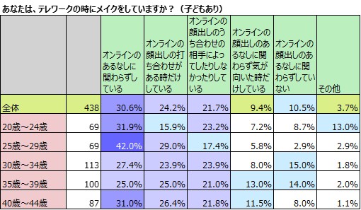 全体では「オンラインの顔出しの打ち合わせがある時だけメイクをしている」女性は27.4%に。また、「オンラインの有無にかかわらずメイクをしている」人は、子どもあり派が30.6%、子どもなし派が17.9%に。「オンラインの顔出しの有無にかかわらずメイクをしていない」人は、子どもあり派が10.5%、子どもなし派は26.1%と、倍以上の差があった。テレワークをしている子どもあり派の女性は、保育所・幼稚園などへの送り迎えや、地域の人々との交流があることが想定され、常に身だしなみを整えている人が多いと言えそうだ。