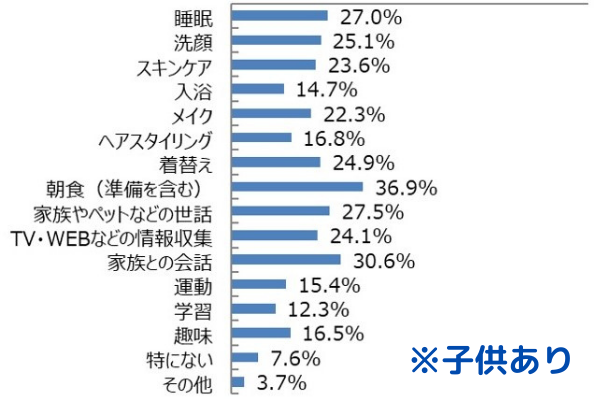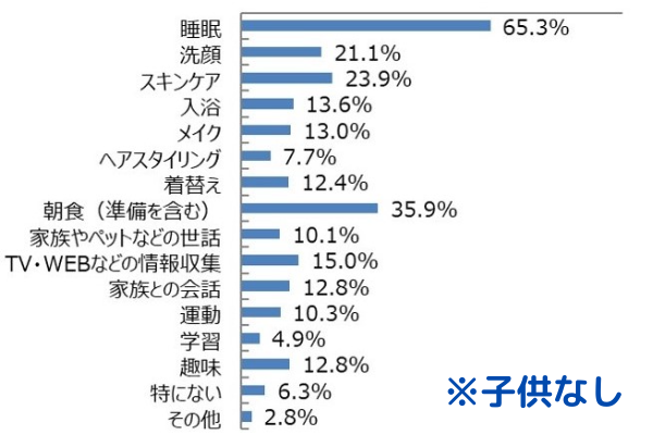 結果は、全体では最多が「睡眠」(48.8%)で、約半数の人が該当した。以下、「朝食」(36.3%)、「スキンケア」(23.7%)と続いた。子どもの有無別で見ると、子どもあり派は1位が「朝食」(36.9%)、2位が「家族との会話」(30.6%)、3位が「家族やペットの世話」(27.5%)となった。一方、子どもなし派は1位が「睡眠」(65.3%)、2位が「朝食」(35.9%)、3位が「スキンケア」(23.9%)だった。