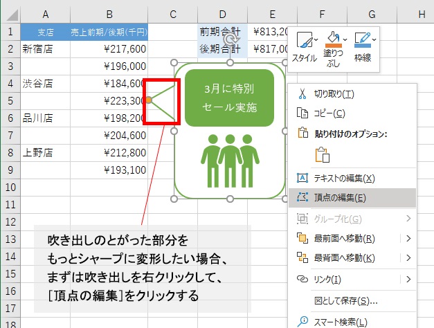 また、とがった部分が太いと、隠れてしまうセルの領域も増えてしまう。そこで、吹き出しのとがった部分をもっとシャープに変形したいとする。まずは吹き出しを右クリックして、[頂点の編集]をクリックする。