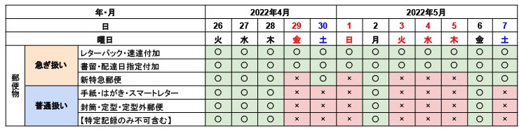 上記の表では、普通扱いの郵便は土日祝と行わないため、配達先とタイミングによっては4月28日~5月6日まで届かないといったこともあり得ます。