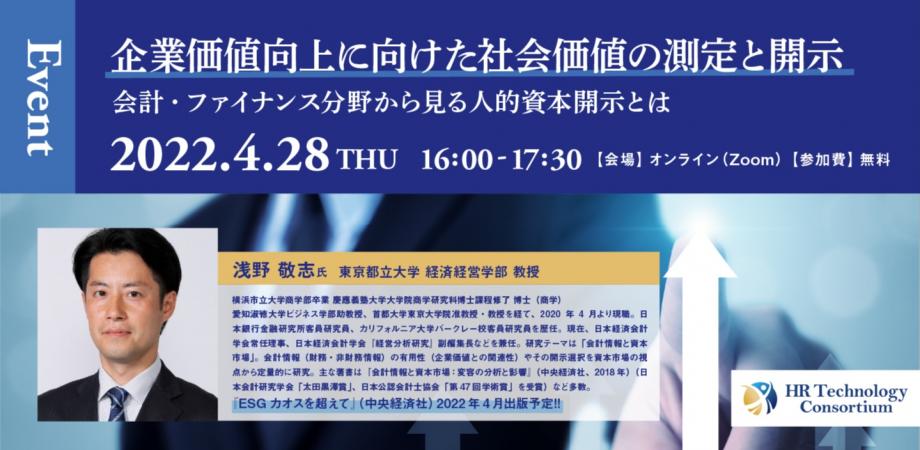 HRテクノロジー活用やデータ分析を経営に活かすことの有用性を啓発・推進する一般社団法人HRテクノロジーコンソーシアム(代表理事:香川 憲昭氏、以下HRT)が、2022年4月28日に「企業価値向上に向けた社会価値の測定と開示~会計・ファイナンス分野から見る人的資本開示とは~」をテーマにオンラインイベントを開催する。