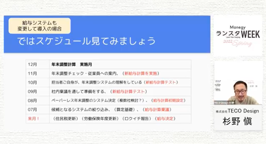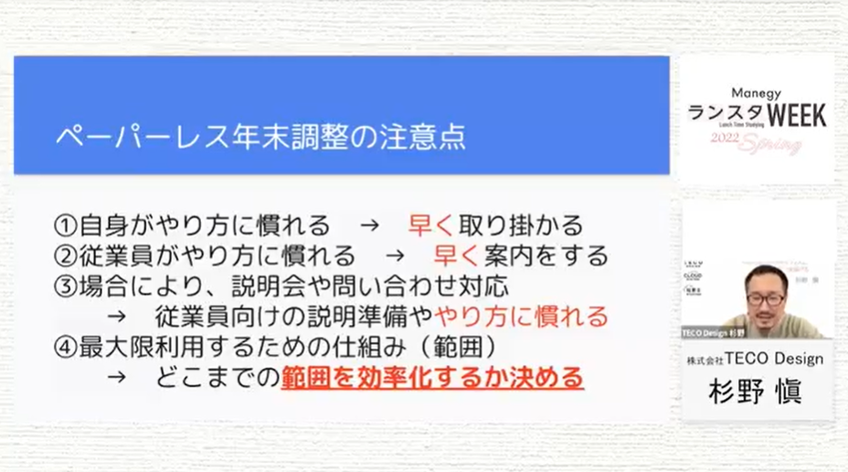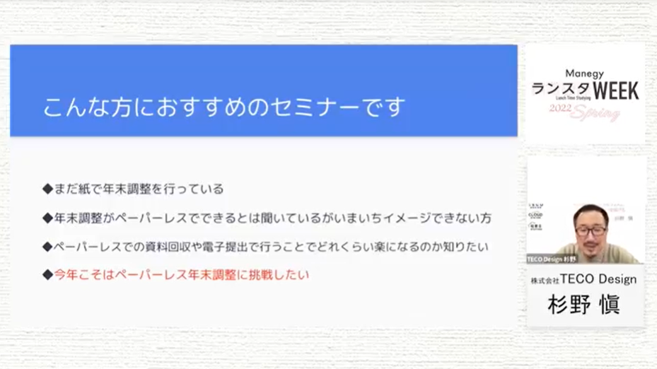シリーズ第1弾は、株式会社TECO Design 杉野 愼 氏(Money Foward クラウド年末調整)による『【今年こそ】年末調整ペーパーレス化のメリットと注意点』について。