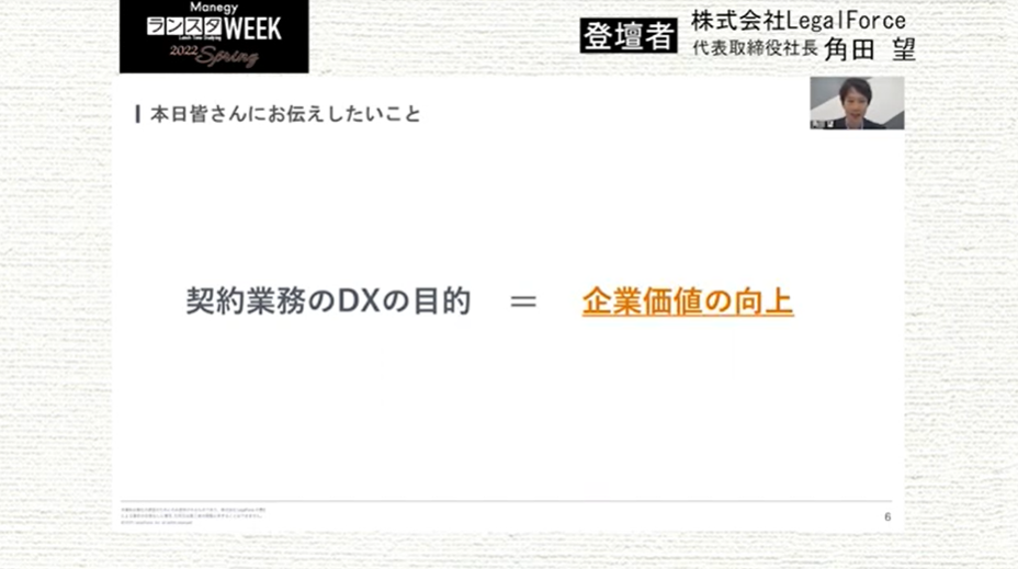 シリーズ第2弾は、株式会社LegalForce / 代表取締役社長 / 弁護士 角田 望 氏による『契約業務DXがもたらす企業価値の向上』について。