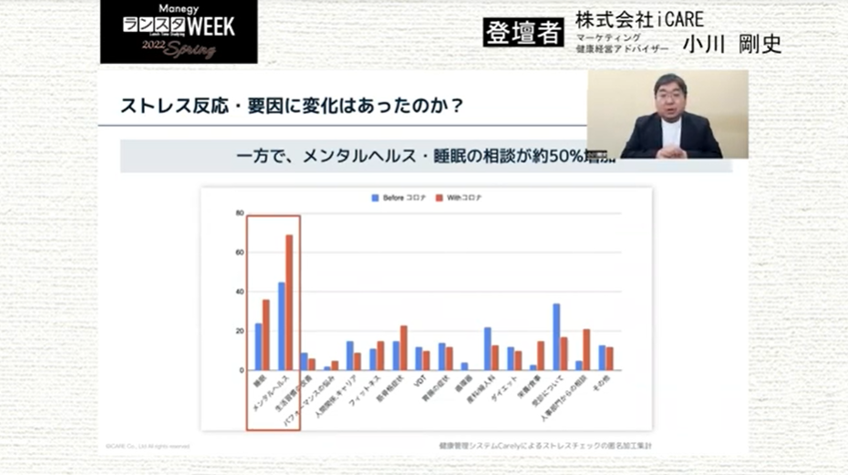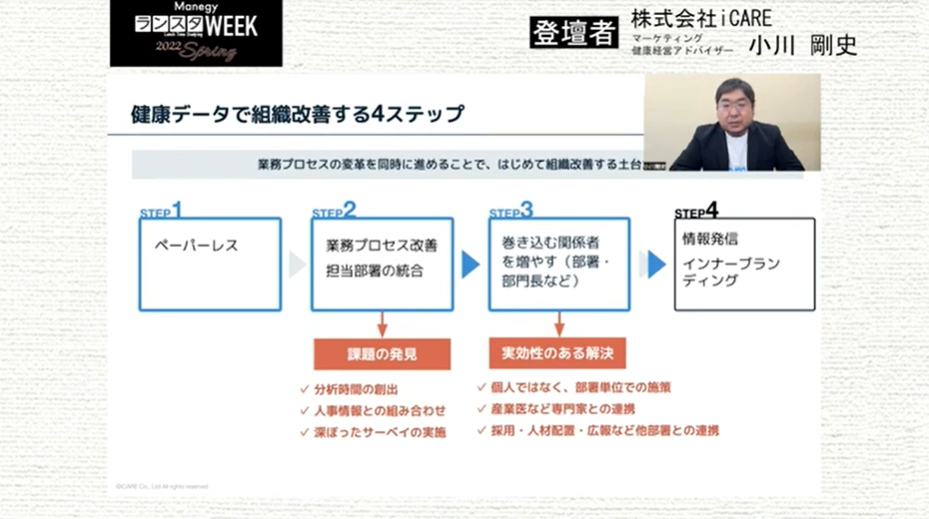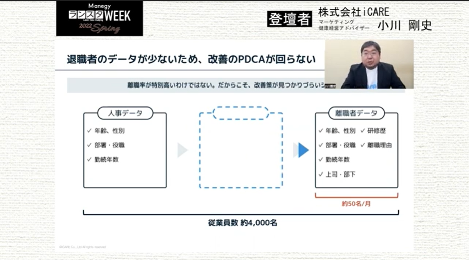 シリーズ第5弾は、株式会社iCARE 小川 剛史 氏による『従業員の離職のカギは健康データにアリ!データを活用した離職予防のノウハウを徹底解説!』について。
