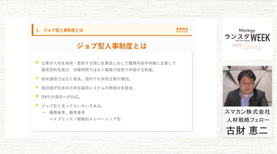 冒頭では、ジョブ型人事戦略を実現するためのタレントマネジメントのポイントをお話する前に、おさらいとしてジョブ型人事制度そのものについてお話いただきました。