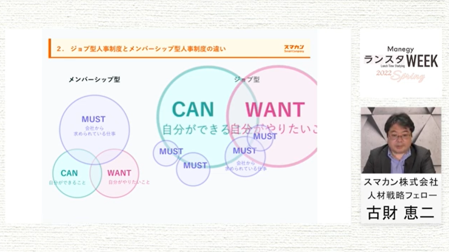 セッション中盤ではジョブ型人事制度とメンバーシップ型人事制度の違いについて解説いただきました。