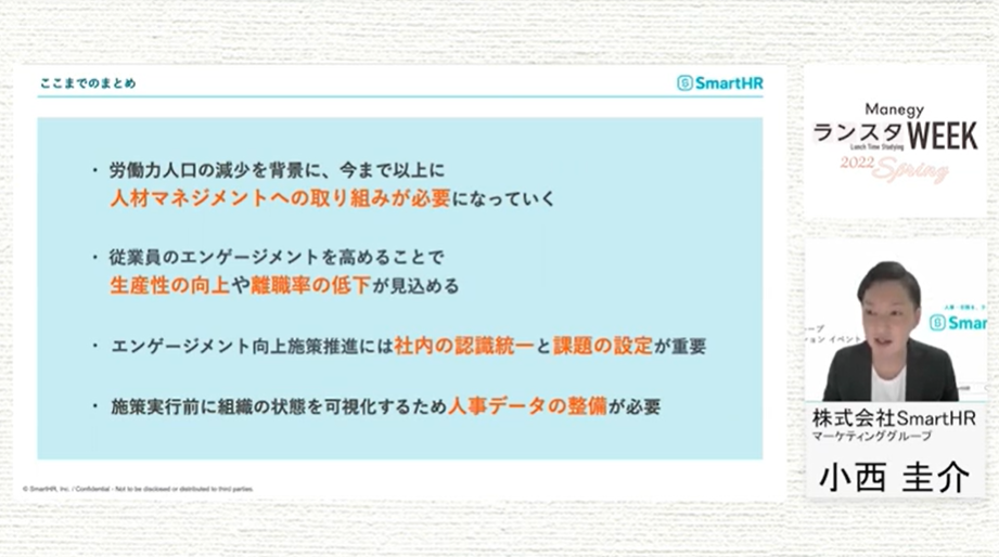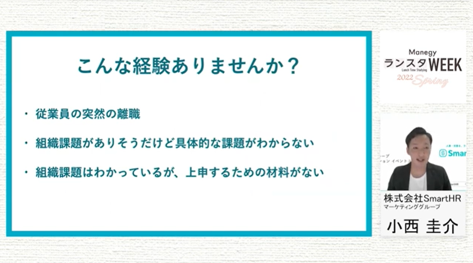 シリーズ第9弾は、株式会社SmartHR 小西 圭介 氏による『組織課題が見つかる「人事データ×サーベイ」の活用法 エンゲージメントを高め、変化に適応するこれからの組織づくり』について。