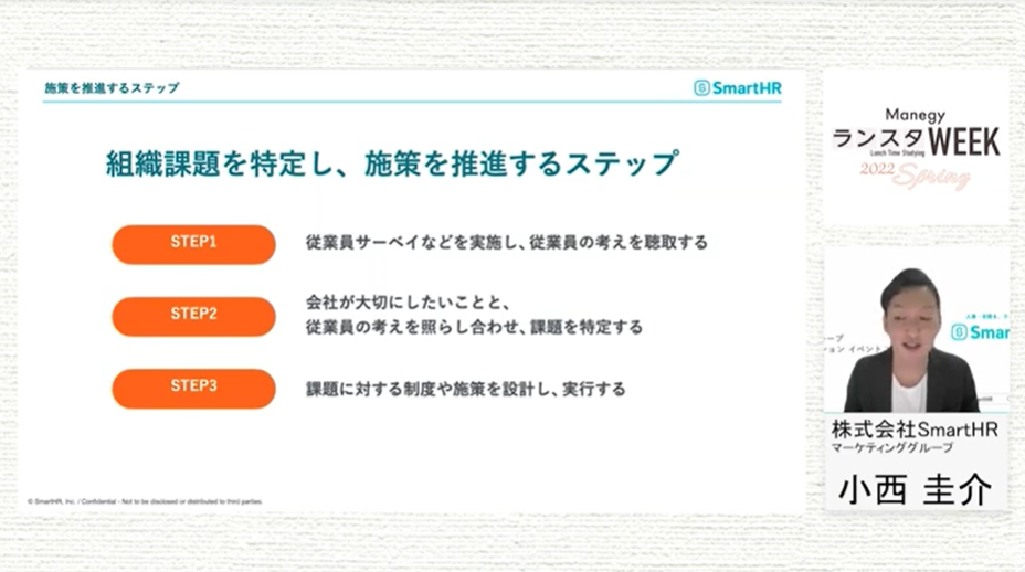 セッションの中盤では、組織課題を特定し、施策を推進するステップをご紹介いただきました。