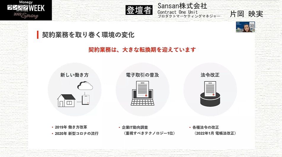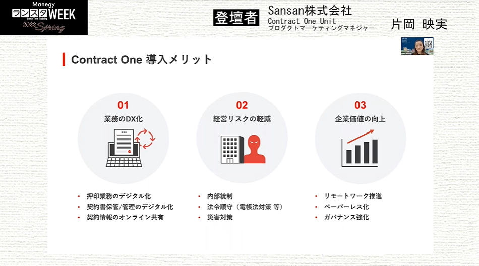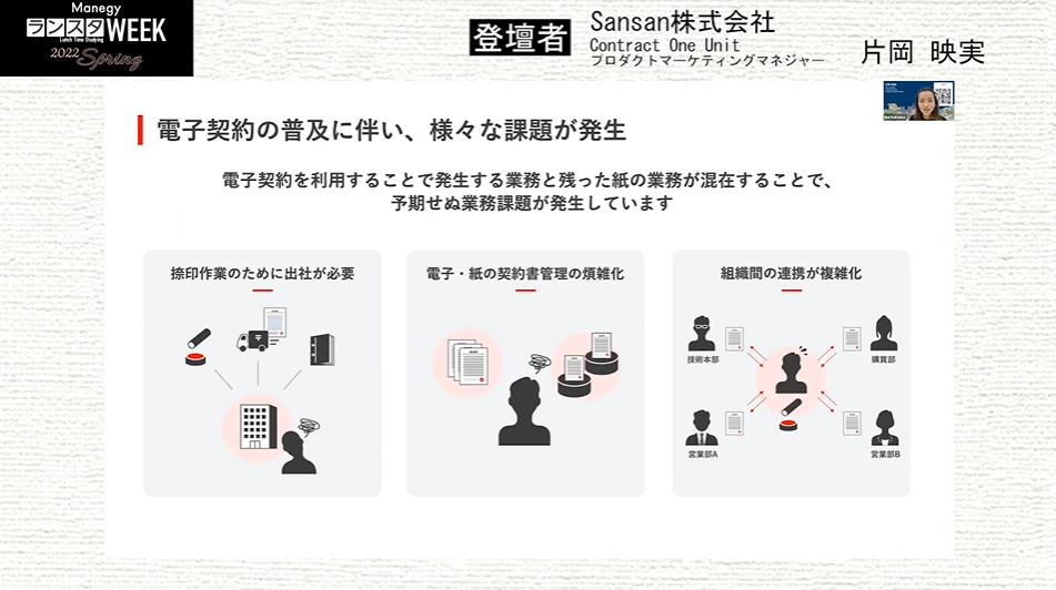 シリーズ第10弾は、Sansan株式会社 片岡 映実 氏による『〜契約書のペーパーレス化を実現〜いまだ残る紙の契約書もオンラインで締結!電子契約も含めて契約書管理を効率化する方法とは』について。