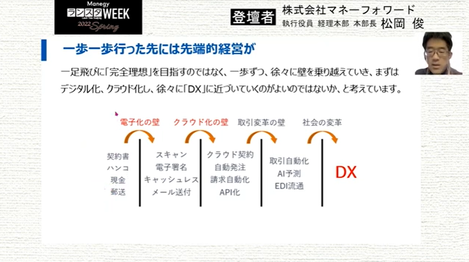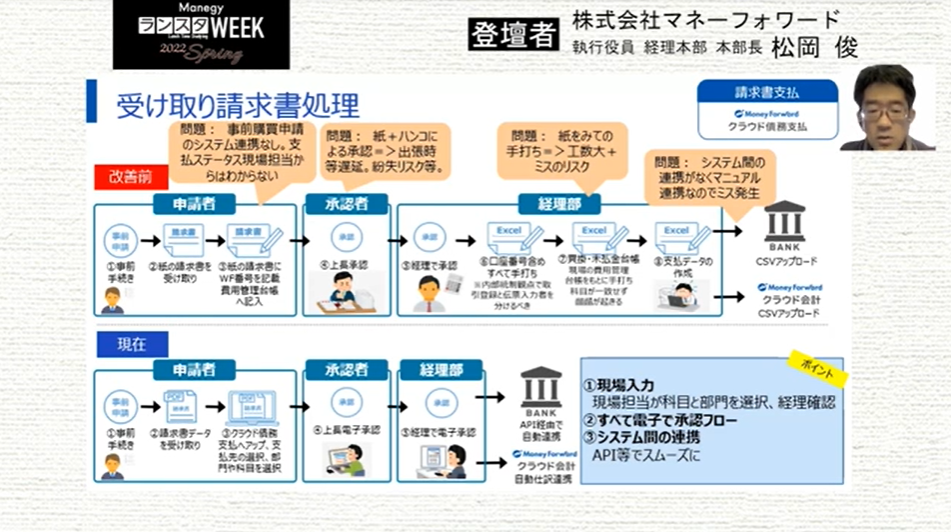 シリーズ第11弾は、株式会社マネーフォワード 松岡 俊 氏による『経理本部長が語る、まず取り組むべき電子化業務とは?法改正に備えた施策と共に解説』について。