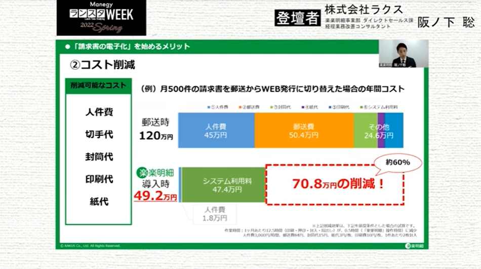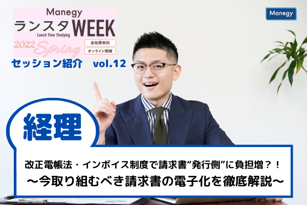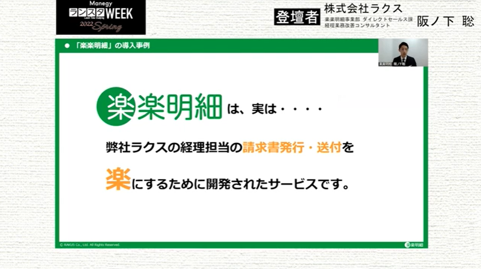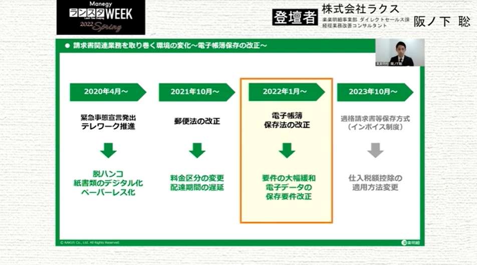 シリーズ第12弾は、株式会社ラクス 阪ノ下 聡 氏による『改正電帳法・インボイス制度で請求書“発行側”に負担増?!~今取り組むべき請求書の電子化を徹底解説~』について。