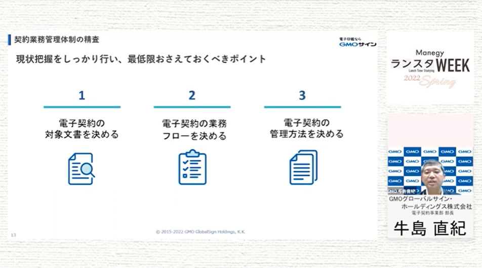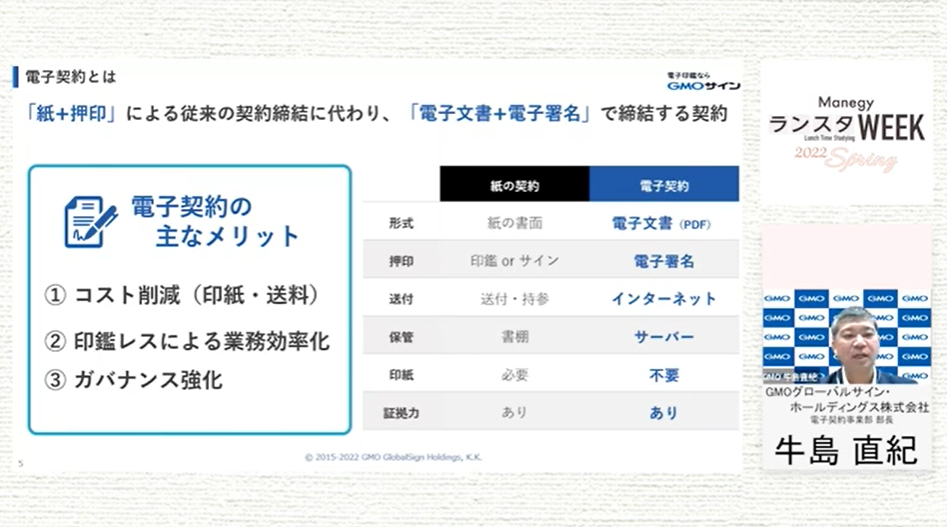 シリーズ第17弾は、GMOグローバルサイン・ホールディングス株式会社 牛島 直紀 氏による『電子化しやすい契約書としづらい契約書の違いとは?元法務担当者が法的根拠や業務フローを基に解説』について。