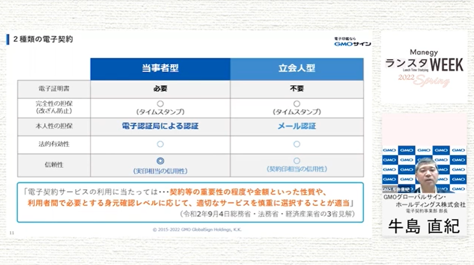 セッションの中盤では、電子契約のタイプ別に解説いただきました。