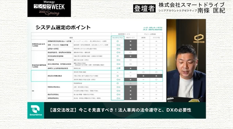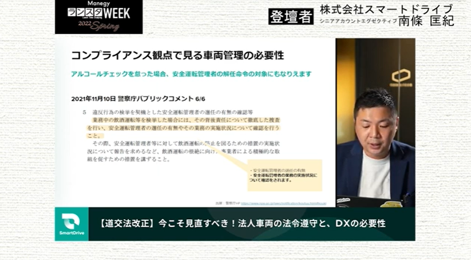 シリーズ第19弾は、株式会社スマートドライブ 南條 匡紀 氏による『【道交法改正】今こそ見直すべき!法人車両の法令遵守と、DXの必要性』について。