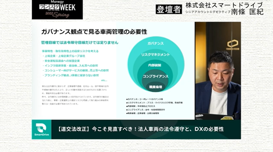 冒頭では、道交法改正を踏まえて、コンプライアンス観点で見る車両管理の必要性を解説しました。
