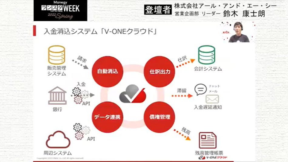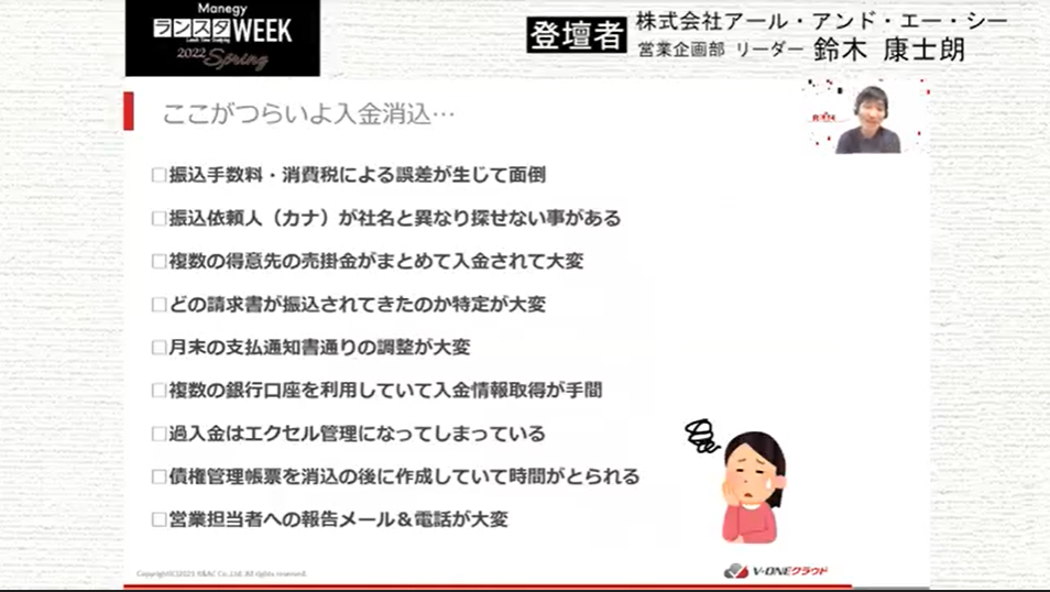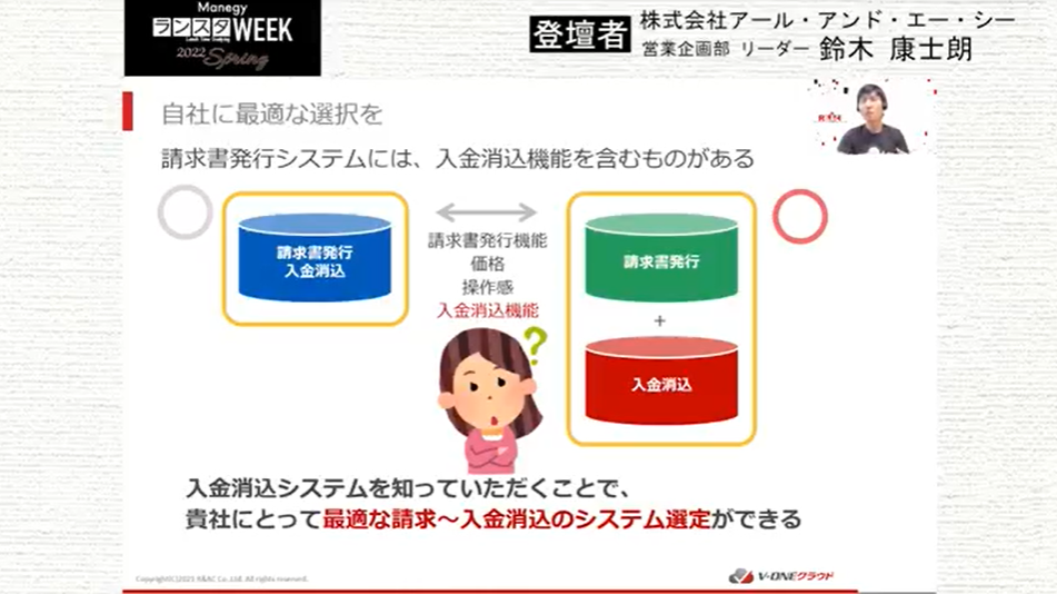 シリーズラストとなる第20弾は、株式会社アール・アンド・エー・シー 鈴木 康士朗 氏による『電帳法・インボイス制度が話題の今こそ考えたい!ピンポイントで導入できる「入金消込クラウド」のススメ』について。