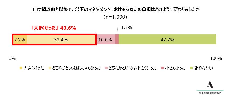 まず、アンケートの1問目は「コロナ禍以前と以後で、部下のマネジメントにおけるあなたの負担はどのように変わりましたか」と質問。その結果は、40.6%が「大きくなった」と回答した。部下のマネジメントは「コロナ禍で負担が増加した」と考えている管理職が多いようだ。