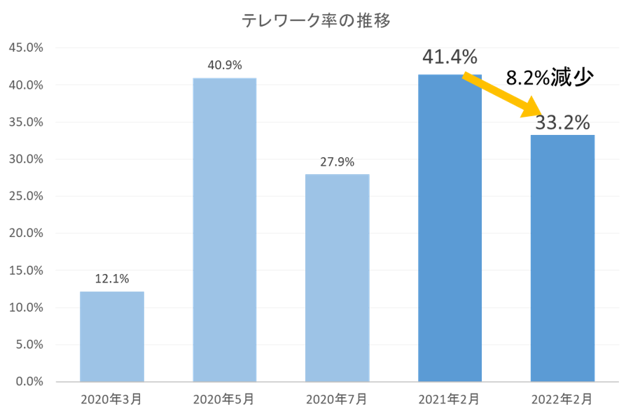 最初の質問では、アンケート参加者たちのテレワーク利用状況について尋ねた。テレワークを「利用している」人は全体(n=1,093)の33.2%で、「利用していない」人は66.8%。緊急事態宣言下で行った2021年2月の同調査時に比べると、テレワーク利用者は8.2ポイント減少している。