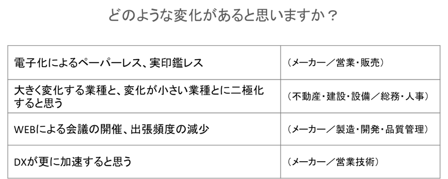 また、Web会議による出張頻度の減少、勤務地のフリー化など、働き方の多様化へ言及する意見も見られた。