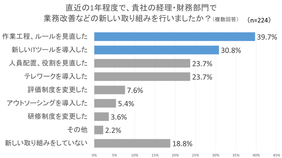 さらに、経理・財務部門で業務改善などの新しい取り組みを直近1年で行ったか質問した(n=224)。