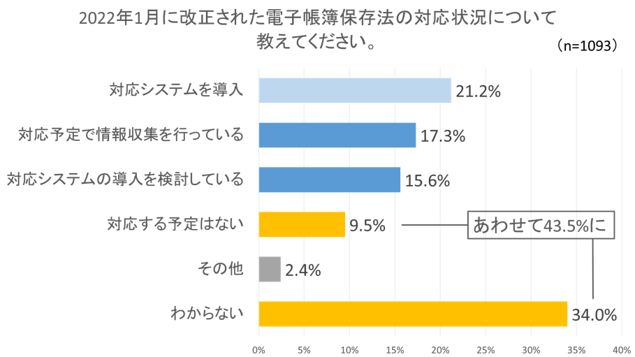その電子帳簿保存法改正について、対応状況をアンケートで聞いている(n=1,093)。結果は「対応システムを導入している」のは21.2%に留まり、「対応する予定はない」「わからない」と回答した人が合わせて43.5%を占めた。