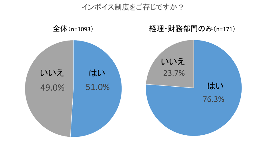 また、インボイス制度の認知度について聞いてみると、「知っている」と回答したのは全体(n=1,093)では51.0%に(前回比21.6%増)。経理・財務部門(n=171)に限定すると76.3%だった(前回比29.5%増)。一方で、経理・財務部門で「知らない」と回答した人は23.7%、さらに「開始時期を知らない」人も10.5%存在する。
