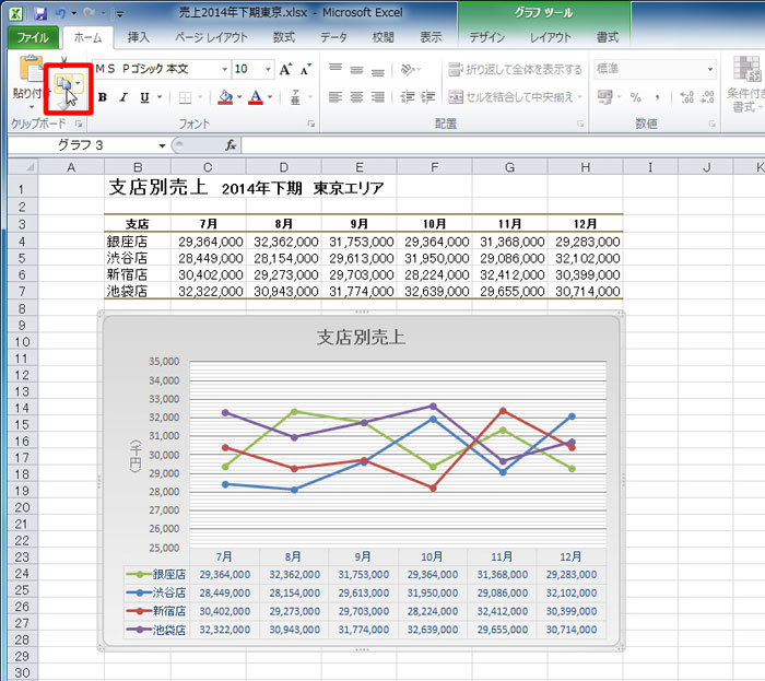 そして、元となるグラフを選択した後、[ホーム]タブの[コピー]をクリックする。
