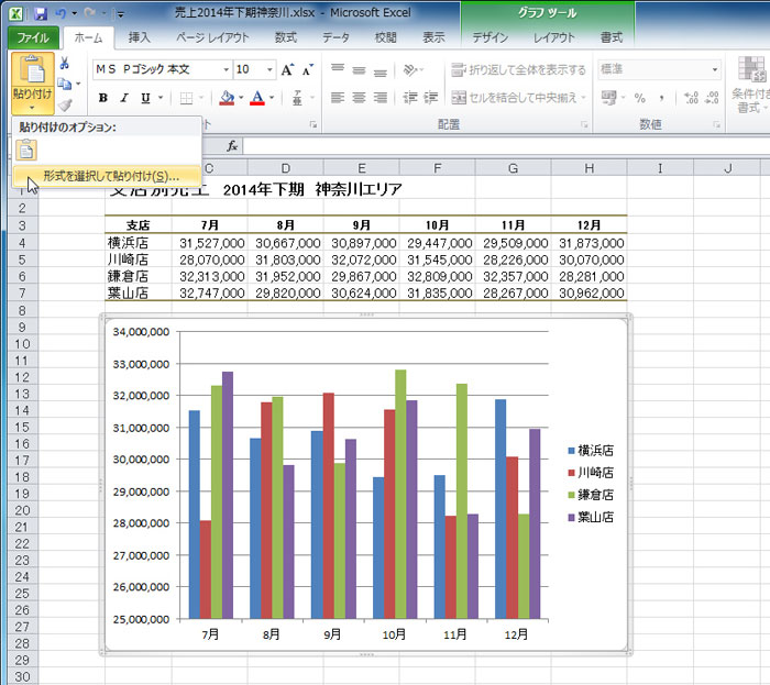 コピー先のグラフを選択した状態で、[ホーム]タブの[貼り付け]の[▼]をクリックし、[形式を選択して貼り付け]をクリックする。
