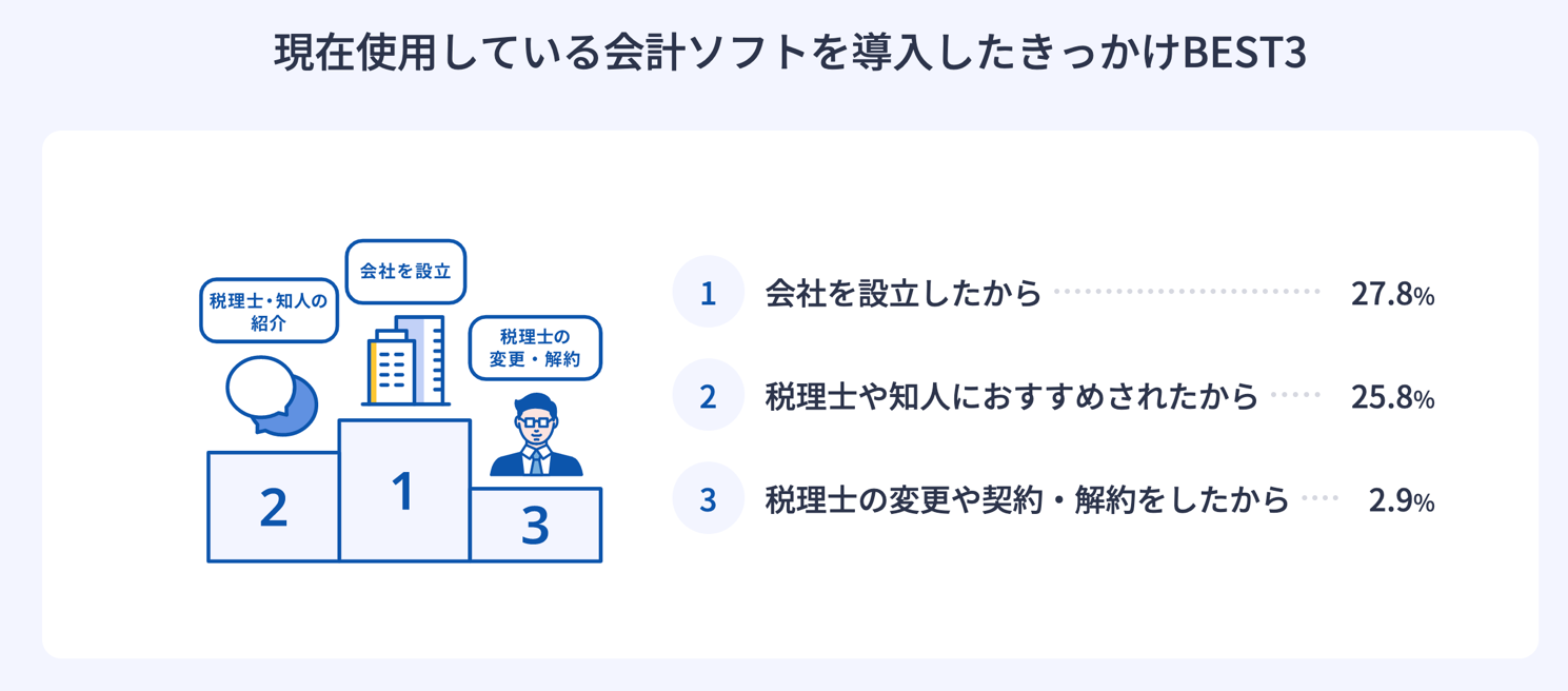 従業員数50名以下の中小企業経営者が会計ソフトを導入したきっかけの1位は「会社を設立したから」27.8%、2位が「税理士・知人におすすめされたから」25.8%、3位が「税理士の変更や契約・解約をしたから」2.9%、という結果となりました。