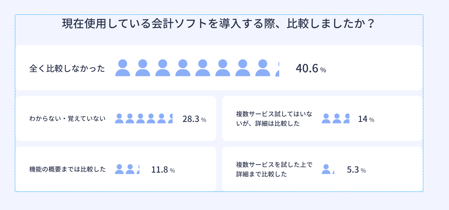 「現在使用している会計ソフトを導入する際、比較しましたか?」という質問に対し、40.6%の経営者が「全く比較しなかった」と解答。機能の概要や詳細などを比較した経営者は全体の3割程度であることがわかりました。中でも、「複数サービスを試した上で詳細まで比較した」経営者は5.3%にとどまりました。