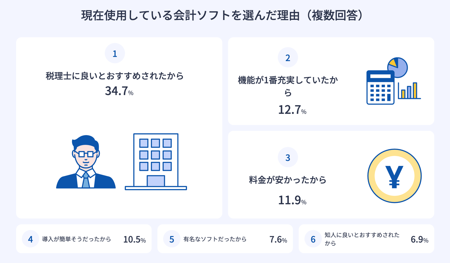 「現在使用している会計ソフトを選んだ理由」については、1位が「税理士に良いとおすすめされたから」34.7%、2位が「機能が1番充実していたから」12.7%、3位が「料金が安かったから」11.9%という結果になりました。税理士の推薦がそのまま採用につながるケースが多いようです。