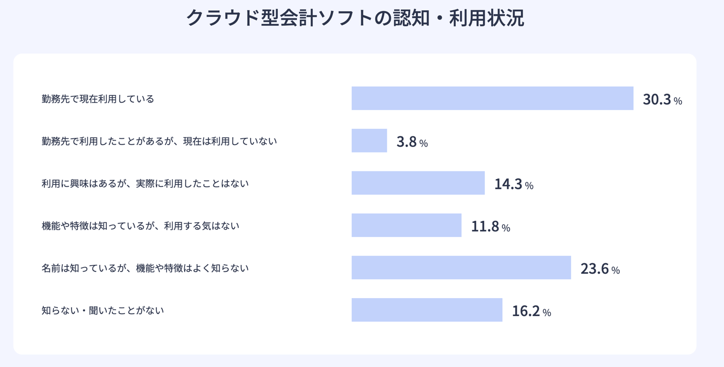クラウド型会計ソフトの認知・利用状況については、「勤務先で現在利用している」「勤務先で利用したことがあるが、現在は利用していない」と答えた割合は34.1%という結果となりました。