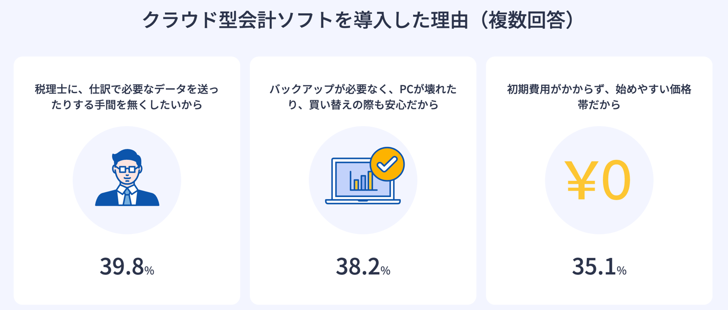クラウド型会計ソフトを導入した理由は、1位が「税理士に仕訳で必要なデータを送ったりする手間を無くしたいから」39.8%、2位が「バックアップが必要なくPCが壊れたり買い替えの際も安心だから」38.2%、3位が「初期費用がかからず始めやすい価格帯だから」35.1%という結果になりました。