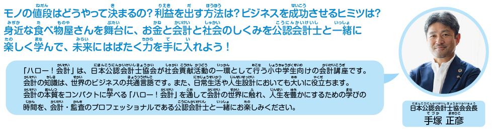 日本公認会計士協会は2022年7~8月に、小学3年生~中学3年生を対象とした会計講座「ハロー!会計」を、会場開催の対面方式とオンライン方式の2パターンで開催します。会社やお店をテーマに会計の基礎知識を無料で楽しく学べる、子ども向けの講座です。