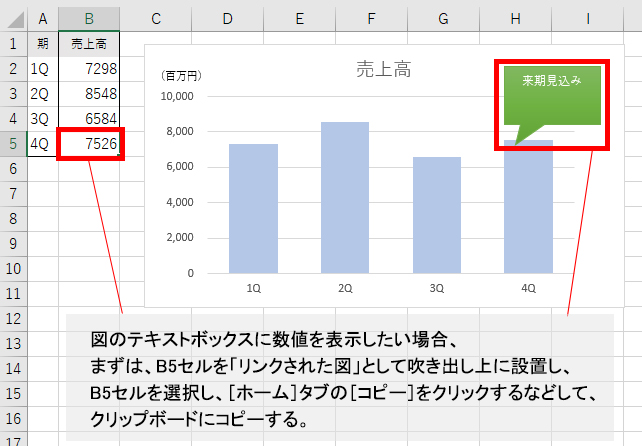 この吹き出しの中に、図のテキストボックスを設けて数値を表示する場合、B5セルのデータである見込みの売上高に変更があると、吹き出し上のテキストボックスの数値もその都度書き換えなければならない。そこで使えるのが、「リンクされた図」の機能だ。今回は、B5セルを「リンクされた図」として吹き出し上に設置してみる。